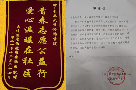 近日,大连市泡崖街道康全社区、康盛社区向金沙官网人工智能学院送来感谢信,向2021级大数据专业学生于敬鑫赠送锦旗。对寒假期间,学校和人工智能学院大力支持并且积极号召大学生返乡参与疫情防控工作表示感谢。