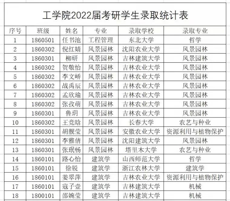 2022年研究生录取工作已接近尾声,工学院工程管理专业学生任书池和建筑学专业学生路心怡分别以398分和374分的好成绩被东北大学和山西师范大学录取。工学院2022届192名学生中,50名学生参加研究生考试,27人顺利通过国家线,考研上线率达50%,录取18人,录取率达36%,尤其是学院风景园林专业录取率达到42.85%,学院有3个班级的考研率均超过18.51%。这一连串闪亮的数字,是该学院聚焦立德树人根本任务、紧盯人才培养目标、用力提升人才培养质量、用心助力考研学子的生动体现。
