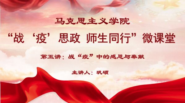 4月27日,“战‘疫’思政 师生同行”微课堂(五)准时开讲。本期微课堂的主题是“战‘疫’中的感恩与奉献”,由马克思主义学院青年教师巩硕主讲。