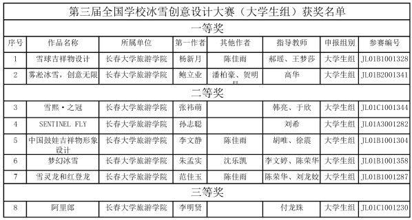 在国赛比赛前,由吉林省教育厅指导,吉林省高校冰雪创意大赛组委会主办了“冰雪嘉年华,创意你我他”为主题的吉林省赛,面向省内所有高校在校大学生征集冰雪产品类、冰雪概念类和冰雪环境空间类作品。金沙官网艺术学院选送114件参赛作品,47件作品获奖。其中,一等奖19项、二等奖16项、三等奖14项。