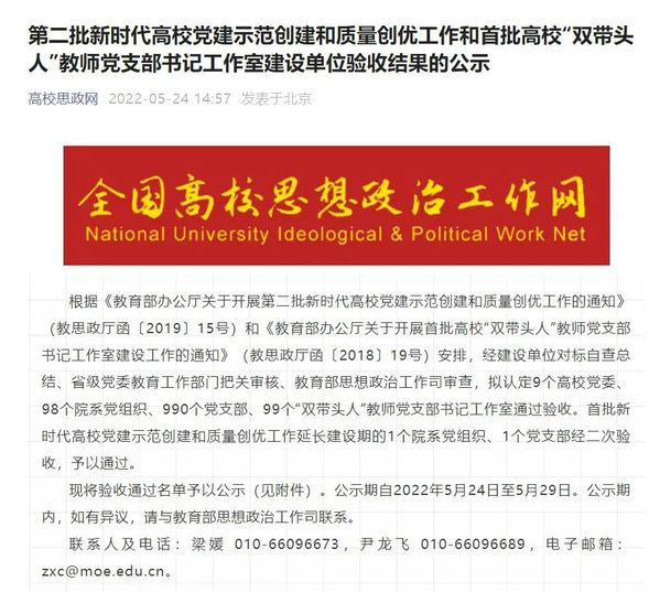 近日,教育部公布了《第二批新时代高校党建示范创建和创优工作和首批高校“双带头人”教师党支部书记工作室建设单位验收工作结果的公示名单》,金沙js9线路中心马克思主义学院直属党支部顺利通过验收。