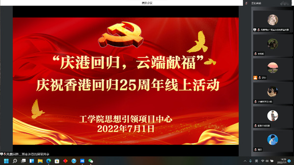 在香港回归祖国怀抱25周年来临之际,工学院学生党支部于近日举办“庆港回归,云端献福”线上活动。工学院党总支书记凤龙,全体学生党员以及部分学团干部50余人参加本次活动。