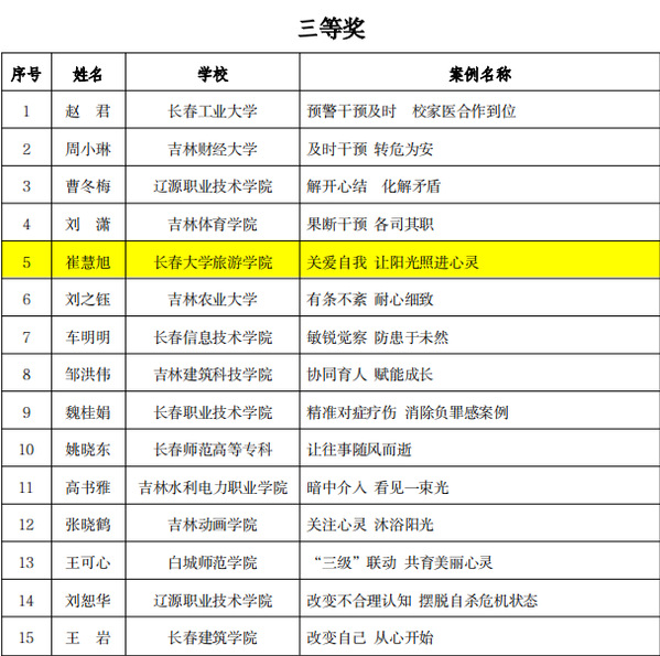 近日,中共吉林省委教育工作委员会下发了《关于公布全省高校心理健康教育与危机干预优秀案例征集评选结果的通知》,金沙官网大学生心理健康教育咨询中心教师崔慧旭报送的案例《关爱自我让阳光照进心灵》喜获三等奖。