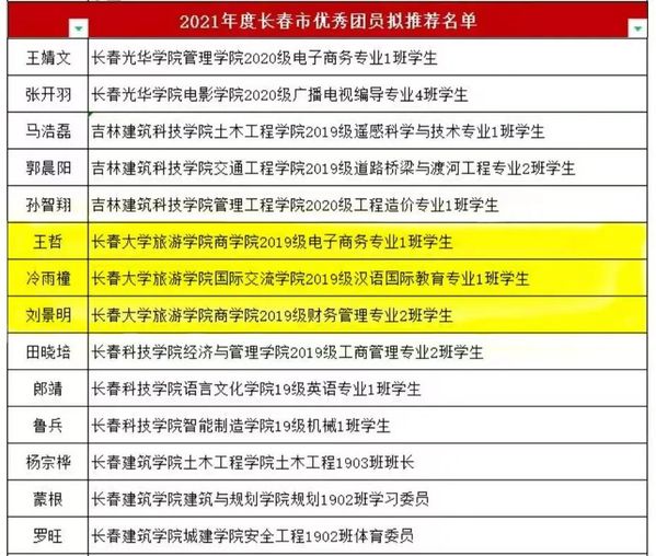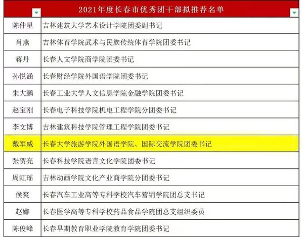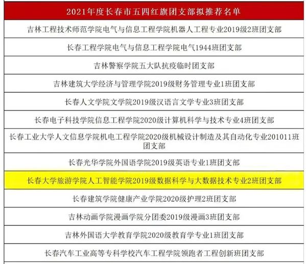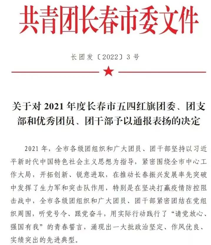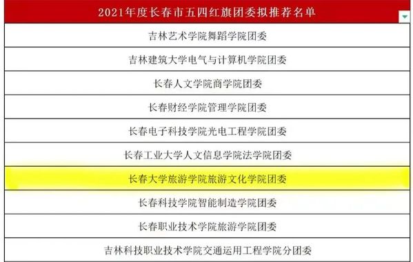 近日,共青团长春市委发布《关于对2021年度长春市五四红旗团委、团支部和优秀团员、团干部予以通报表扬的决定》。金沙官网旅游文化学院团委荣获“五四红旗团委”荣誉称号;人工智能学院2019级数据科学与大数据技术专业2班团支部荣获“五四红旗团支部”荣誉称号;外国语学院、国际交流学院团委书记戴军威荣获“优秀团干部”荣誉称号;商学院2019级电子商务专业1班王哲、2019级财务管理专业2班刘景明,国际交流学院2019级汉语国际教育专业1班冷雨橦荣获“优秀团员”荣誉称号。