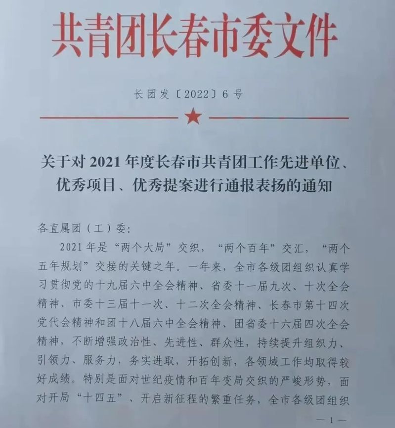 近日,共青团长春市委下发《关于对2021年度长春市共青团工作先进单位、优秀项目、优秀提案进行通报表扬的通知》,金沙官网“专项服务团队赴河北服务保障北京2022年冬奥会和冬残奥会”被评为“2021年度长春市共青团工作优秀项目”并给予通报表扬。