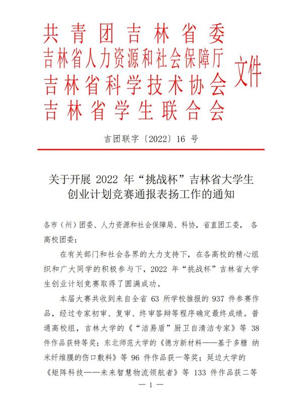 近日,共青团吉林省委、吉林省人力资源和社会保障厅、吉林省科学技术协会、吉林省学生联合会联合下发《关于开展2022年“挑战杯”吉林省大学生创业计划竞赛通报表扬工作的通知》(吉团联字〔2022〕16号),学生作品《衣伴旅——冰雪旅游运动服饰创新设计及应用》斩获省赛决赛一等奖,并代表吉林省跻身全国总决赛;《折叠行李箱》等3件作品获二等奖、《农宝》等9件作品获三等奖;校团委老师于凯获评“优秀指导教师”;学校获评“优秀组织单位”。