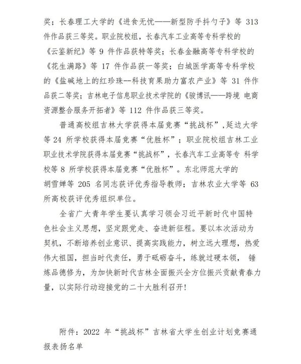 创业新时代,挑战向未来!学校将持续营造更加浓厚的创新创业氛围,广泛掀起金沙官网广大青年学生科研创新热潮,将竞赛与科研、实践相融合,激发并培养青年学生创新精神与创业能力,挖掘、培育和选树创新创业青年人才,为加快新时代吉林全面振兴全方位振兴贡献青春力量,以实际行动迎接党的二十大胜利召开。