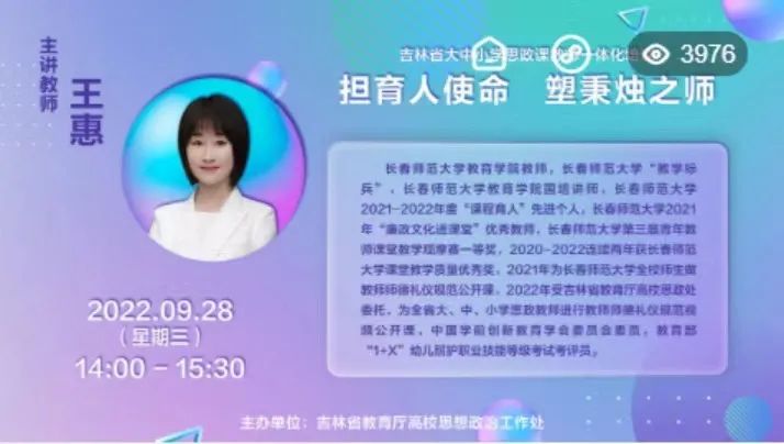 长春师范大学教育学院教师王惠以“担育人使命 塑秉烛之师”为主题授课