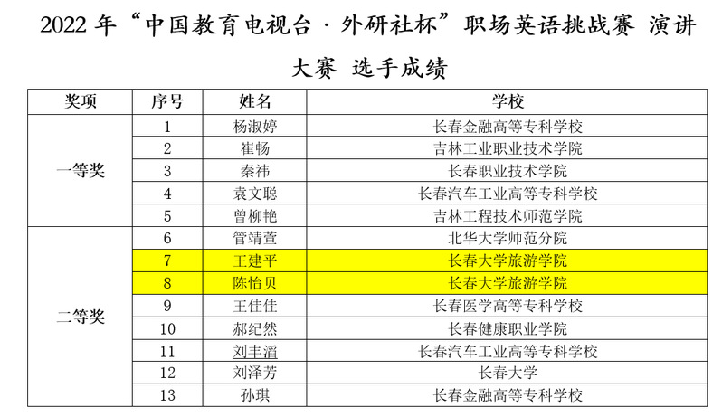 近日,2022年“中国教育电视台·外研社杯”职场英语挑战赛吉林赛区省赛落下帷幕。金沙官网旅游文化学院空乘专业2022级学生王建平、2021级学生陈怡贝脱颖而出,位列第七、第八名,获得演讲大赛二等奖的优异成绩;2021级旅游文化学院导游专业学生张玉莹、人工智能学院计算机网络技术专业学生刘嘉铭荣获写作大赛三等奖。