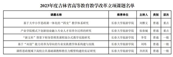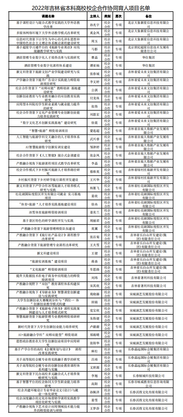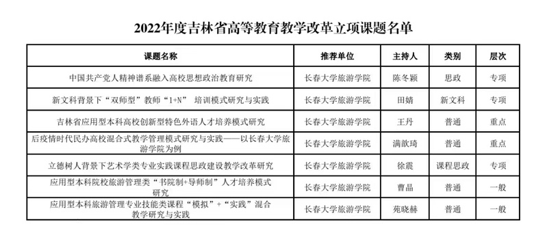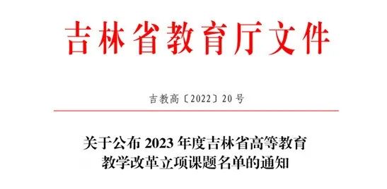 近日,吉林省教育厅公布了《关于公布2022年度吉林省高等教育教学改革立项课题名单的通知》《关于公布2022年度吉林省本科高校校企合作协同育人项目名单的通知》《关于公布2023年度吉林省高等教育教学改革立项课题名单的通知》,吉林省教育厅在各校推荐申报的基础上,经过材料初审和专家通讯评审,最终确立了立项名单。2022年共确立教改课题400项(重点课题120项、一般课题180项、思政专项20项、课程思政专项40项、“四新”专项40 项),2023年共确立教改课题300项(重点课题120项、一般课题180项)。