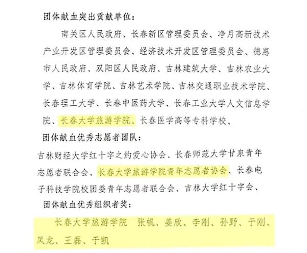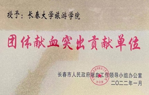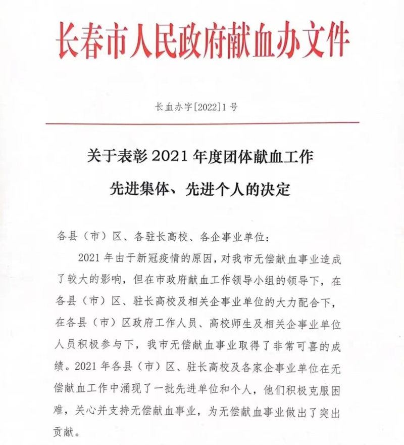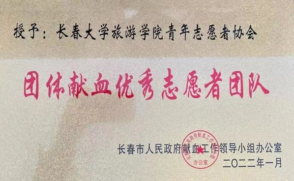 近日,长春市人民政府献血办下发《关于表彰2021年度团体献血工作先进集体、先进个人的决定》(长血办字〔2022〕1号),授予学校“团体献血突出贡献单位”荣誉称号;授予青年志愿者协会“团体献血优秀志愿者团队”荣誉称号;授予校团委张帆等8名同志“团体献血优秀组织者”荣誉称号。
