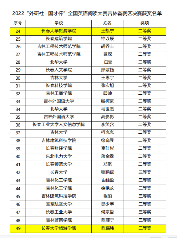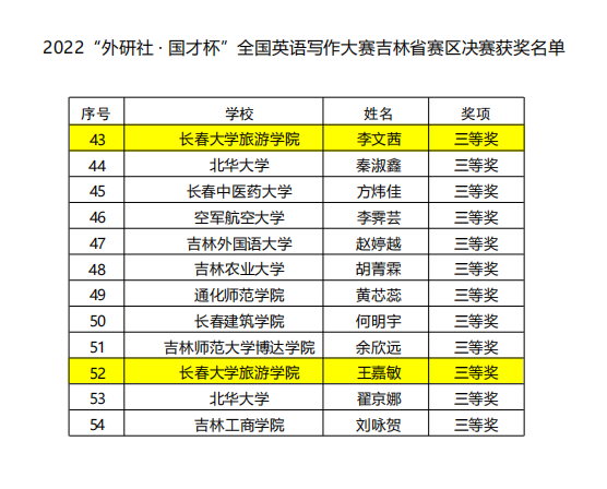 近日,2022年“外研社·国才杯”全国英语阅读、写作大赛吉林赛区决赛落下帷幕。金沙官网2020级商学院人力资源管理专业学生王凯宁和2021级商学院金融学专业学生陈嘉炜分别荣获阅读大赛二等奖和三等奖;2020级外国语学院英语专业学生李文茜、王嘉敏荣获写作大赛三等奖。