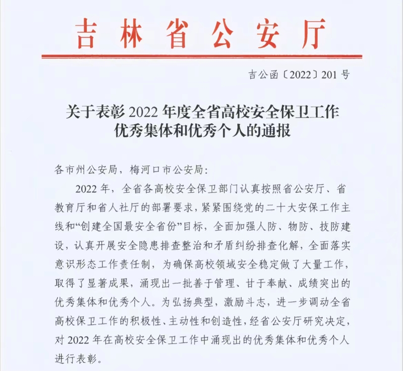 近日,吉林省公安厅印发了《关于表彰2022年度全省高校安全保卫工作优秀集体和优秀个人的通报》,以此通报表扬2022年度在我省高校安全保卫工作中涌现出的优秀集体和优秀个人,金沙官网安全处处长刘晓坤被吉林省公安厅评为“全省高校安全保卫工作先进个人”。