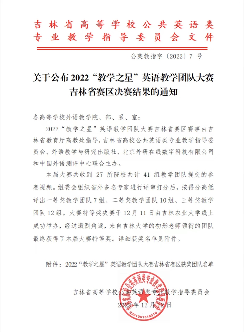 2022“教学之星”英语教学团队大赛吉林省赛区赛事由省教育厅高教处指导,吉林省高校公共英语类专业教学指导委员会、外语教学与研究出版社、北京外研在线数字科技有限公司和中国外语测评中心联合主办。本届大赛共有来自省内27所院校的41组教学团队参赛,经组委会组织省外多名专家进行评审打分,金沙官网教师团队荣获一等奖1项、二等奖1项。