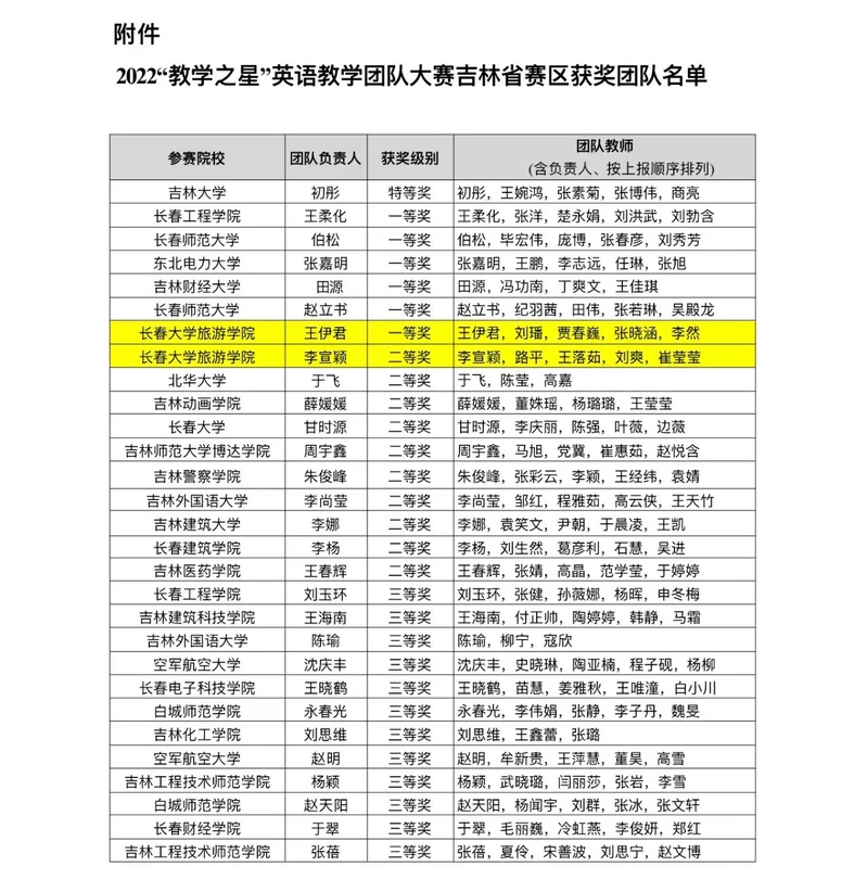 近日,2022“教学之星”英语教学团队大赛吉林省赛区决赛圆满落下帷幕,金沙官网外国语学院王伊君教学团队(刘璠、贾春巍、张晓涵、李然)荣获一等奖,基础部李宣颖教学团队(路平、王落茹、刘爽、崔莹莹)荣获二等奖。
