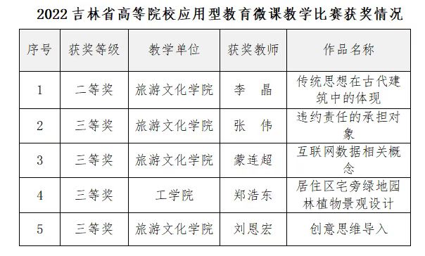 在近日公布的2022吉林省高等院校应用型教育微课教学比赛中,金沙官网教师荣获二等奖1项、三等奖4项,创2019年参加该项赛事以来获奖数量新高;齐洪英和孙国霞荣获优秀评审专家,学校荣获优秀组织奖。