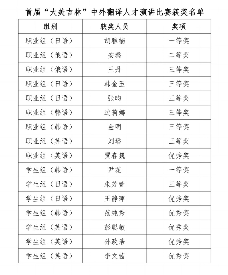 近日,首届“大美吉林”中外翻译人才演讲比赛获奖名单公布,学校外国语学院师生分别在日语、韩语、俄语、英语职业组和学生组比赛中摘获16个奖项,是所有参赛单位中获奖数量最多的。其中,教师喜获一等奖1项、二等奖1项、三等奖6项、优秀奖1项;学生喜获一等奖1项、三等奖1项、优秀奖5项。