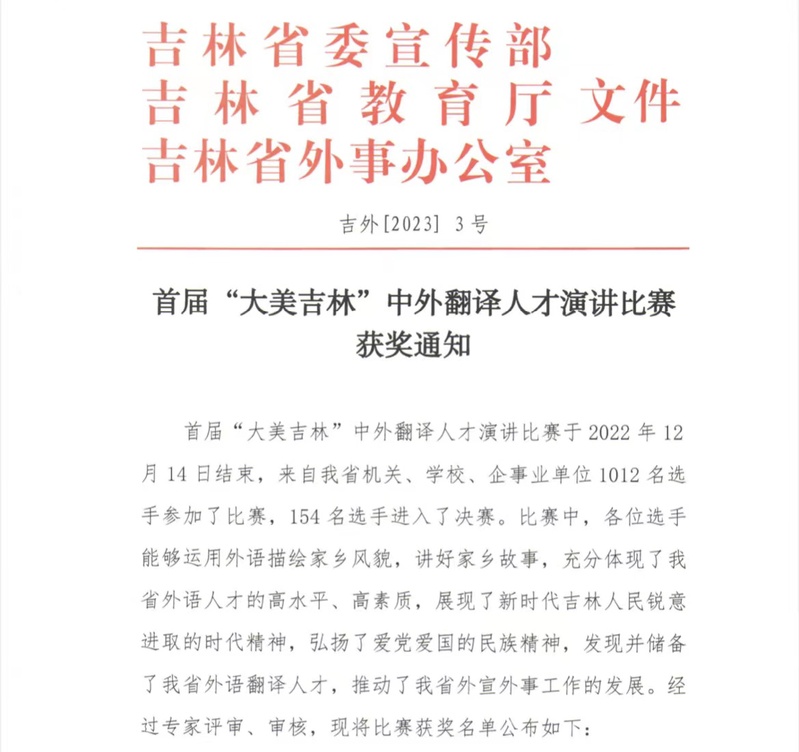 首届“大美吉林”中外翻译人才演讲比赛由吉林省委宣传部、省教育厅、省外事办联合举办,旨在迎接党的二十大,弘扬爱国爱党的民族精神,展现新时代吉林人锐意进取的精神风貌,抒发热爱家乡的美好情感,发现并储备我省高水平外语人才。比赛以“讲好家乡故事,爱我大美吉林”为主题,围绕吉林大地的红色精神、地域特色、典型事迹、发展新貌、生态风光等内容演说“吉林故事”,展示吉林人民在党的领导下创造的幸福生活。