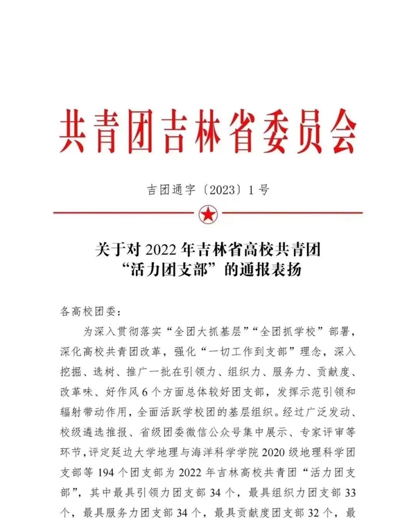 近日,共青团吉林省委发布《关于对2022年吉林省高校共青团“活力团支部”的通报表扬》(吉团通字〔2023〕1号),金沙官网团支部在引领力、组织力、服务力、贡献度、改革味、好作风6个方面取得一等奖1项、二等奖2项、三等奖3项的优异成绩。