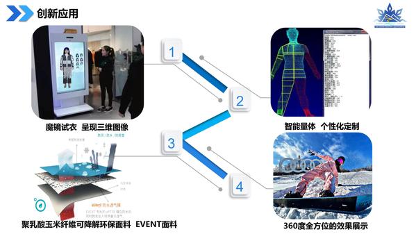 本项目将冰雪旅游运动服饰通过“互联网+科技”融合的新模式,把AR、VR等数字化新技术融入到冰雪装备中,利用3D试衣系统实现试穿冰雪装备的三维图像,做到衣随人动,自然贴身,360度全方位的效果展示,用数字化传播,让冰雪文化“动”起来。同时,依托VR技术,将冰雪服饰用三维立体的方式呈现在手机上,可随时随地通过手机欣赏冰雪旅游,进而展示冰雪韵味,创造更好的消费体验。