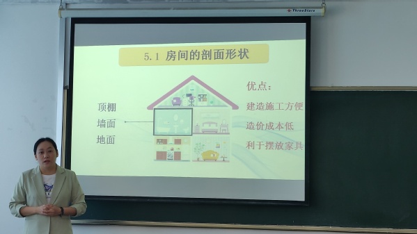 宫越主要讲授《房屋建筑学》课程中“房间的剖面形状”一节,本节课的重点在于让学生掌握在设计房间剖面形状时,需要满足人们的视觉要求和听觉要求。课程中,宫越首先以中国古戏台的演变史为思政线,向学生展示古建筑的精妙设计,又以我国现代化建筑案例,说明设计科学性的重要。在授课过程中,她采用互动式教学和案例教学方法,从身边生活入手,与学生互动交流,巩固知识点。