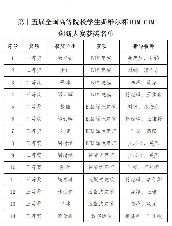 12月23日,第十五届全国高等院校学生“斯维尔杯”创新大赛落下帷幕。学校工学院学生在个人赛5个赛项中共获奖14项。其中,BIM建模(土建)赛项获得一等奖1项、二等奖2项、三等奖1项;BIM绿色建筑赛项获得二等奖2项、三等奖2项;装配式建筑赛项获得二等奖1项、三等奖4项;数字造价赛项获得三等奖1项。