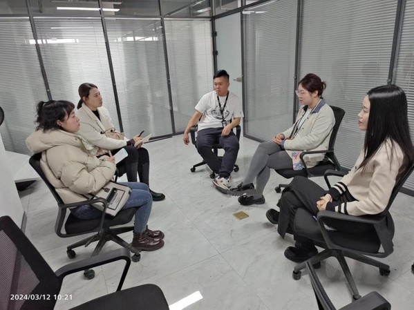刘桐杉介绍了公司新媒体运营部运营情况,包括账号运营、产品选品、货盘团券、达人合作等平台运营流程,详细介绍了各工作岗位的用人要求。刘琦以公司项目“长春本地生活”平台为例,讲述了平台注册、商品券、投图、标题、短视频、产品引流和直播等操作环节。刘恩宏和吕琦与企业具体探讨了课程的直播场景搭建、达人直播、视频脚本制作、拍摄剪辑、话术场控等相关内容和实训方案设计等。