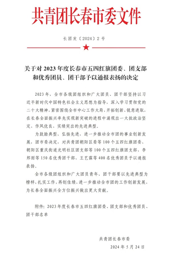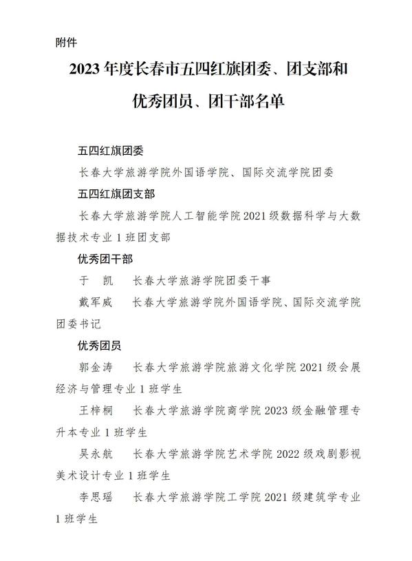 近日,共青团长春市委发布《关于对2023年度长春市五四红旗团委、团支部和优秀团员、团干部予以通报表扬的决定》。学校外国语学院、国际交流学院团委荣获“五四红旗团委”荣誉称号;人工智能学院2021级数据科学与大数据技术专业1班团支部荣获“五四红旗团支部”荣誉称号;校团委干事于凯,外国语学院、国际交流学院团委书记戴军威荣获“优秀团干部”荣誉称号;旅游文化学院2021级会展经济与管理专业1班郭金涛、商学院2023级金融管理专升本专业1班王梓桐、艺术学院2022级戏剧影视美术设计专业1班吴永航、工学院2021级建筑学专业1班李思瑶荣获“优秀团员”荣誉称号。