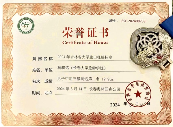 杨骐铭同学荣获男子甲组三级跳远第二名