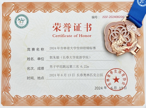郭朱毅同学荣获男子甲组跳远第三名