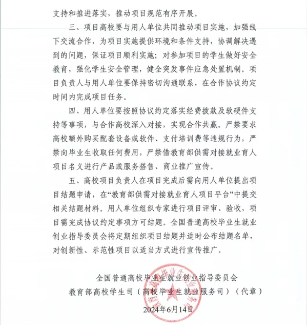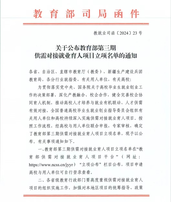 近日,教育部供需对接就业育人项目平台发布《关于公布教育部第三期供需对接就业育人项目立项名单的通知》(教就业司函〔2024〕23号),经学校与企业对接积极申报,学校共获批就业育人项目62项,其中就业实习基地项目37项,定向人才培养培训项目17项,人力资源提升项目7项,重点群体就业帮扶项目1项,获批数量位居省内高校前列。