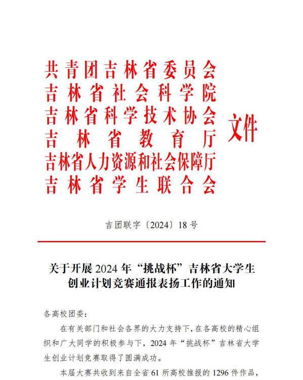 近日,共青团吉林省委员会、吉林省社会科学院、吉林省科学技术协会、吉林省教育厅、吉林省人力资源和社会保障厅、吉林省学生联合会下发《关于开展2024年“挑战杯”吉林省大学生创业计划竞赛通报表扬工作的通知》(吉团联字〔2024〕18号)。在本次竞赛中,学校推报的作品《吉研冰旅 智慧雪服》摘取主赛道金奖、《碍无阻爱》斩获主赛道银奖;《冲锋陷阵——多地形救援勘探者》等14件作品荣获主赛道铜奖;在“社会调查”专项赛中,《软件换真知 笔落惊风雨——公众对知识付费软件意愿和认识调查与分析认知情况调查——以长春地区为例》摘得金奖;同时,《助残有力度,民生有温度—基于吉林省伊通县残疾人事业的典型案例调查》等4项作品荣获铜奖;王健等5位指导教师获评“优秀指导教师”;学校因组织得力,获评“优秀组织单位”。