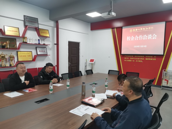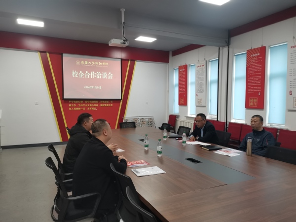 继11月14日召开2025届毕业生秋季校园招聘会(商学院专场)后,商学院金融学专业为与校企合作企业北京指南针科技发展股份有限公司(以下简称北京指南针科技有限公司)实现精准对接,于近日召开校企合作洽谈会。商学院院长胡静波、党总支书记于刚、北京指南针科技有限公司经理杨景川、戴天鑫参加洽谈会。
