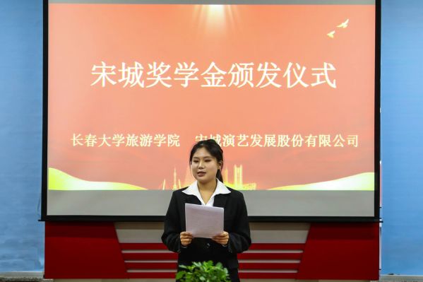 座谈会后,校企双方领导为获得本届长旅宋城奖学金的学生代表进行颁奖。获奖学生代表张彩婷发表了获奖感言。