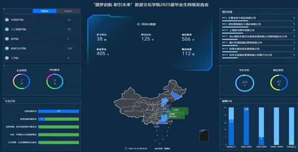 本次双选会参会用人单位共计38家,职位发布125个,提供岗位需求506个,涉及旅游景区、旅行社、酒店餐饮、会展、新媒体运营等多个行业。全校405名毕业生参加线上双选,投递简历112份,为校外实习毕业生提供了更多的优质岗位资源。
