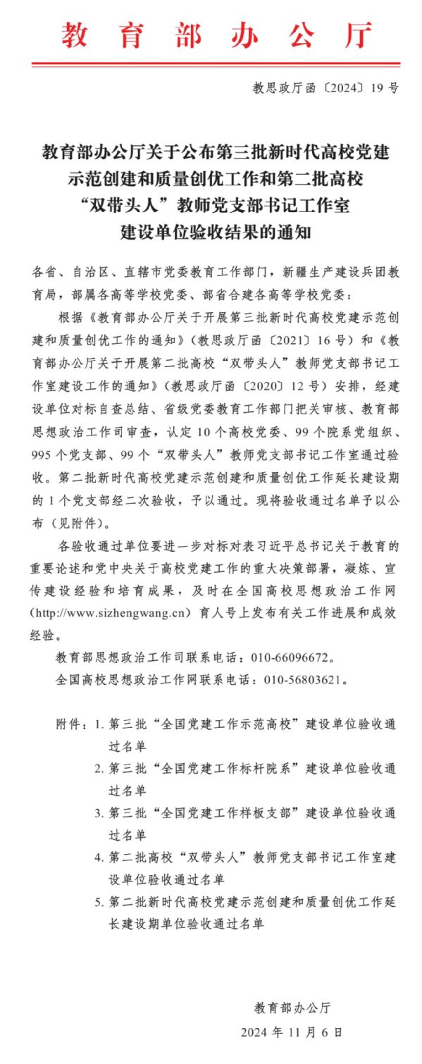 近日,教育部办公厅公布第三批新时代高校党建示范创建和质量创优工作和第二批高校“双带头人”教师党支部书记工作室建设单位验收名单,金沙官网工学院学生党支部顺利通过“全国党建工作样板支部”创建验收。
