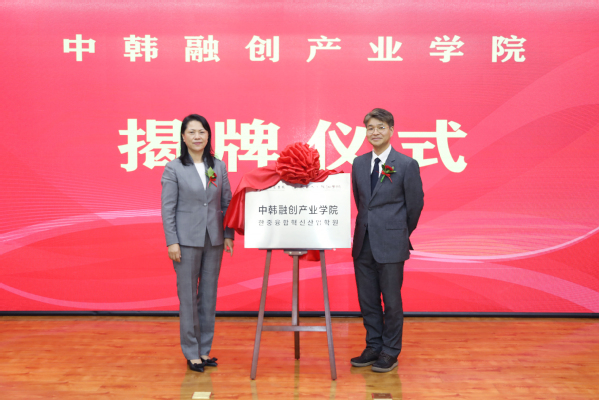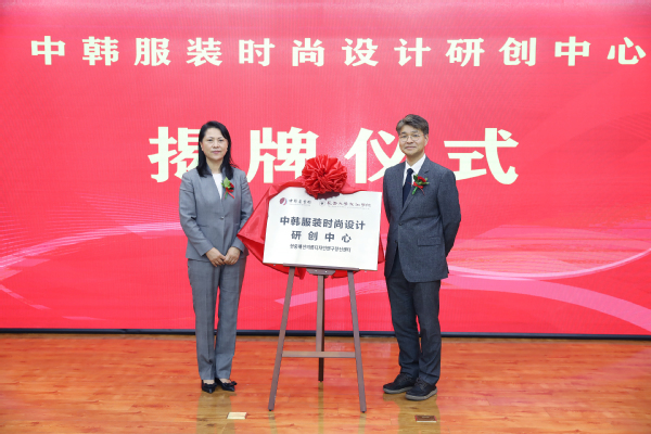 郑晓明、金来湘共同为“中韩融创产业学院”、“中韩服装时尚设计研创中心”揭牌。