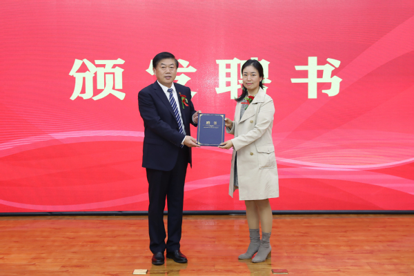 副校长贺柏平为韩国设计师辛贤淑女士颁发客座教授聘书。