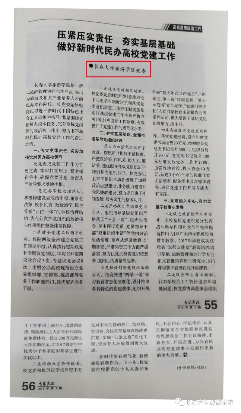 近日,吉林省委机关刊物《吉林通讯》(2018年第三期)和吉林省教育厅官网吉林省高校思想政治工作专栏相继刊发金沙官网党委题为《压紧压实责任 夯实基层基础 努力书写新时代民办高校党建工作奋进之笔》的党建经验文章。