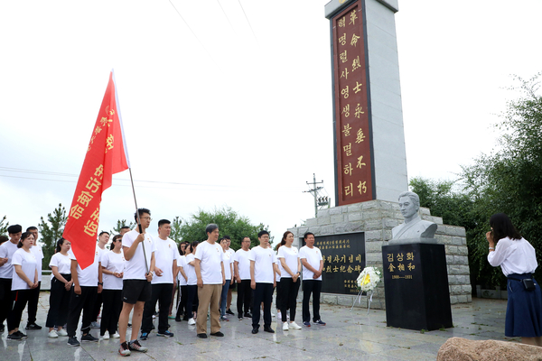7月20日,在“山山金达莱、村村纪念碑”的汪清县,学员们先后来到红日村党性教育基地和大荒沟党性教育基地进行学习教育。在金相和烈士陵园,学员们含着热泪聆听了授课老师讲解汪清县第二任县委书记、抗日志士金相和领导全县基层党组织在群众中宣传党的抗日主张、开展各种抗日活动的英雄事迹,革命先烈宁死不屈、用生命保守党的秘密的民族大义和坚定的政治信仰深深震撼着在场每一位党员的心灵。全体学员怀着无比崇敬的心情,在金相和烈士墓前敬献花篮,重温入党誓词,庄严宣誓为共产主义奋斗终身。