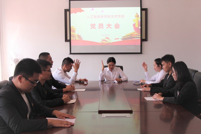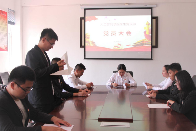 我院学生党支部于2021年9月4日中午11点40分,在综合楼201教室召开此次党员大会。本次会议由人工智能学院学生党支部书记朱琳主持,参会人员有人工智能学院党总支书记王磊、教师党员王筱惠,人工智能学院学生党员邵岩、宫景吉、梁玉洁、司恒坤、张欣晟、刘宇杰、李佳琦、朱竞雯、佟冠华、孟欣、陈蒙、王小敏、王芯悦、田佳琳、于方淇、贺中浩、刘颖、于婉鑫参与本次会议。