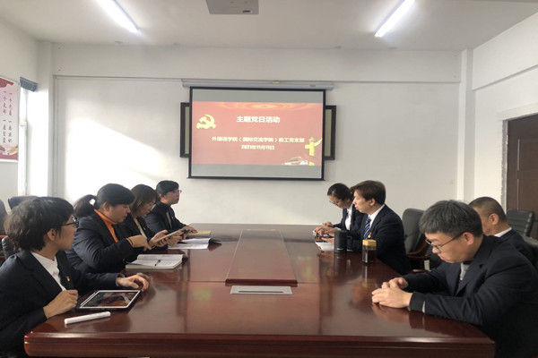 11月11日,外国语学院(国际交流学院)教工党支部在综合实训楼201党团活动室召开2021年11月份党员大会,会议由支部书记张昀主持。