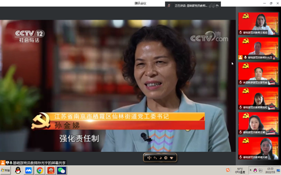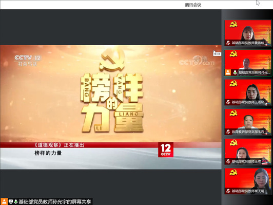 为庆祝中国共产党成立101周年,大力宣传全国优秀共产党员、全国先进基层党组织等的先进事迹,中央组织部党员教育中心联合中央广播电视总台社教节目中心,在中央电视台社会与法频道(CCTV12)《道德观察》栏目播出《榜样的力量(第一季)》,宣传先进典型事迹。7月5日下午1点,基础部党总支组织全体党员集中观看,学习优秀共产党员的先进事迹,争做优秀共产党员。22名党员参加了此次活动,活动由基础部党总支副书记王落茹主持。