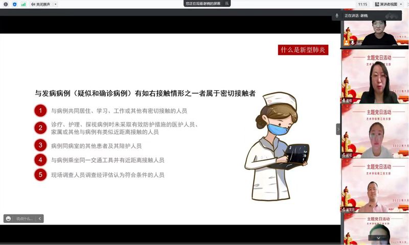 为推动支部教师党员干部充分发挥作用,在疫情防控工作中凝心聚力、担当作为,9月22日下午,艺术学院教工党支部召开“抗疫,‘艺’起行动”主题党日活动,支部无教学任务的党员教师参加此次会议,会议由支部书记谢楠主持。
