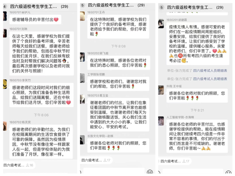 此次全国大学英语四六级考试,在校长助理、继续教育学院院长贾烊统筹安排下,教务处、学生工作处以及净月校区等各部门通力合作,凝心聚力,积极为学生提供良好的备考环境。驻守在净月校区的党员同志充分发挥先锋模范作用,物资准备,核酸采样,考场通风、消杀,居寝服务保障,为考试学生筑起安全屏障。