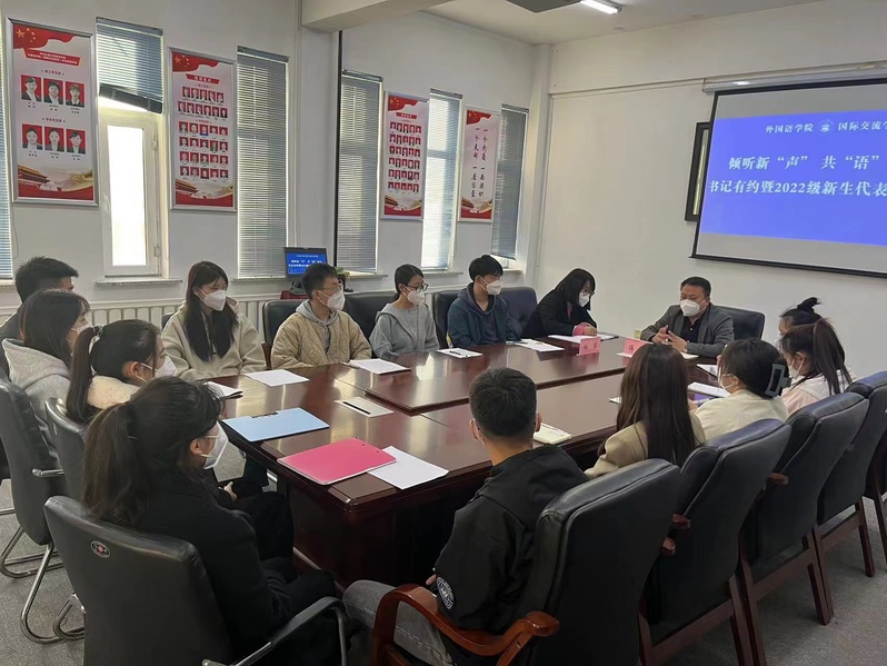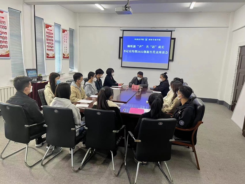 心向阳光,逐梦长旅。为了解新生入校以来的所思所想所感,进一步提升为学生服务的能力,10月5日,外国语学院、国际交流学院召开“倾听新‘声’,共‘语’成长”书记有约暨2022级新生代表座谈会。学院党总支副书记蒋森,团委书记戴军威,新生辅导员柳睿以及来自英语、日语、朝鲜语、俄语、汉语国际教育等五个专业的12名新生代表共同参加。