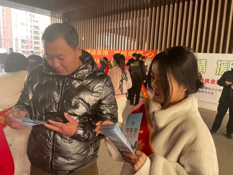在德容街道朗天社区2023年春风行动暨就业援助月招聘现场,青年志愿者们热情服务,耐心细致地为在场求职者提供指引及相关咨询工作,向求职者发放“春风行动卡”及政策宣传手册,帮助其了解相关招聘信息,为招聘企业和求职者搭建面对面沟通桥梁。