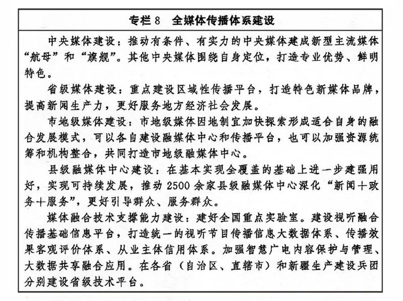 加快推进媒体深度融合发展,有效整合各种媒介资源、生产要素,推动在信息内容、技术应用、平台终端、管理手段等方面共融互通,打造一批具有强大影响力、竞争力的新型主流媒体。统筹处理好传统媒体和新兴媒体、中央媒体和地方媒体、主流媒体和商业平台、大众化媒体和专业性媒体的关系,建立以内容建设为根本、先进技术为支撑、创新管理为保障的全媒体传播体系。推进内容生产供给侧结构性改革,完善高质量内容产出机制,推广互动式、服务式、场景式传播。强化新一代信息技术支撑引领作用,支持主流媒体重塑采编流程、建设平台终端、优化管理手段、强化版权保护、打造媒体资源数据库、提升内容生产力、占据传播制高点。创新媒体业态、传播方式和运营模式,强化用户连接,发挥制度优势和市场作用,增强主流媒体竞争力。
