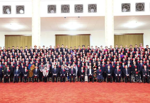 2021年2月25日,全国脱贫攻坚总结表彰大会在北京人民大会堂隆重举行。会前,习近平等会见全国脱贫攻坚楷模荣誉称号获得者,全国脱贫攻坚先进个人、先进集体代表,全国脱贫攻坚楷模荣誉称号个人获得者和因公牺牲全国脱贫攻坚先进个人亲属代表等,并同大家合影留念。新华社记者 鞠鹏 摄