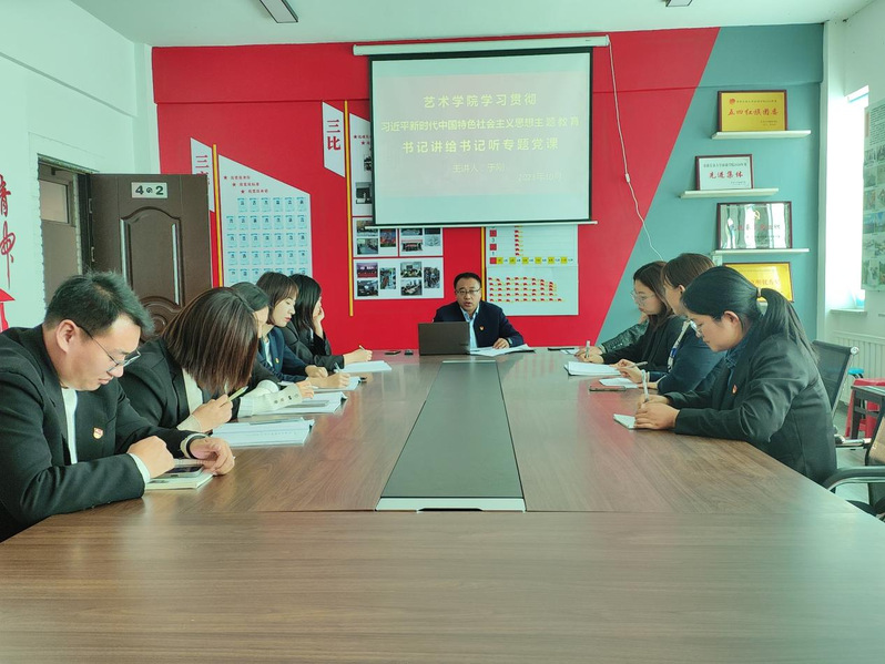 为深入学习贯彻习近平新时代中国特色社会主义思想,推动主题教育走深走实,10月26日,艺术学院党总支书记于刚在综合楼402会议室讲授了主题为“感悟新思想 奋进新征程”的专题党课,进一步加强理论武装,推动主题教育各项工作落到实处,艺术学院各党支部书记、支部委员参加此次党课学习。